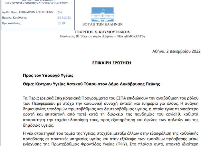 Δεκ122022 Επίκαιρη ερώτηση: κέντρο υγείας αστικού τύπου στον Δήμο Λυκόβρυσης-Πεύκης ΔΙΑΒΑΣΤΕ ΠΕΡΙΣΣΟΤΕΡΑ