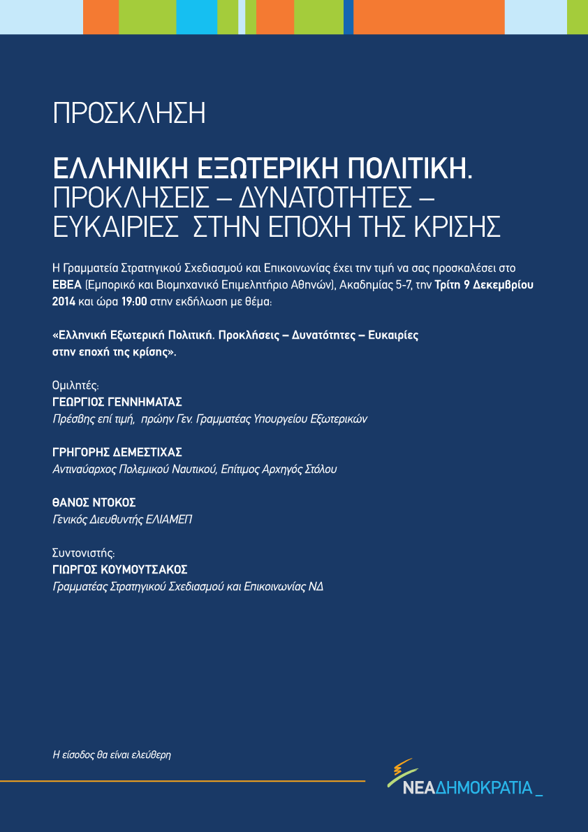 Η εκδήλωση θα πραγματοποιηθεί στο ΕΒΕΑ (Εμπορικό και Βιομηχανικό Επιμελητήριο Αθηνών) Ακαδημίας 7, την Τρίτη 9 Δεκεμβρίου 2014 και ώρα 19:00 .