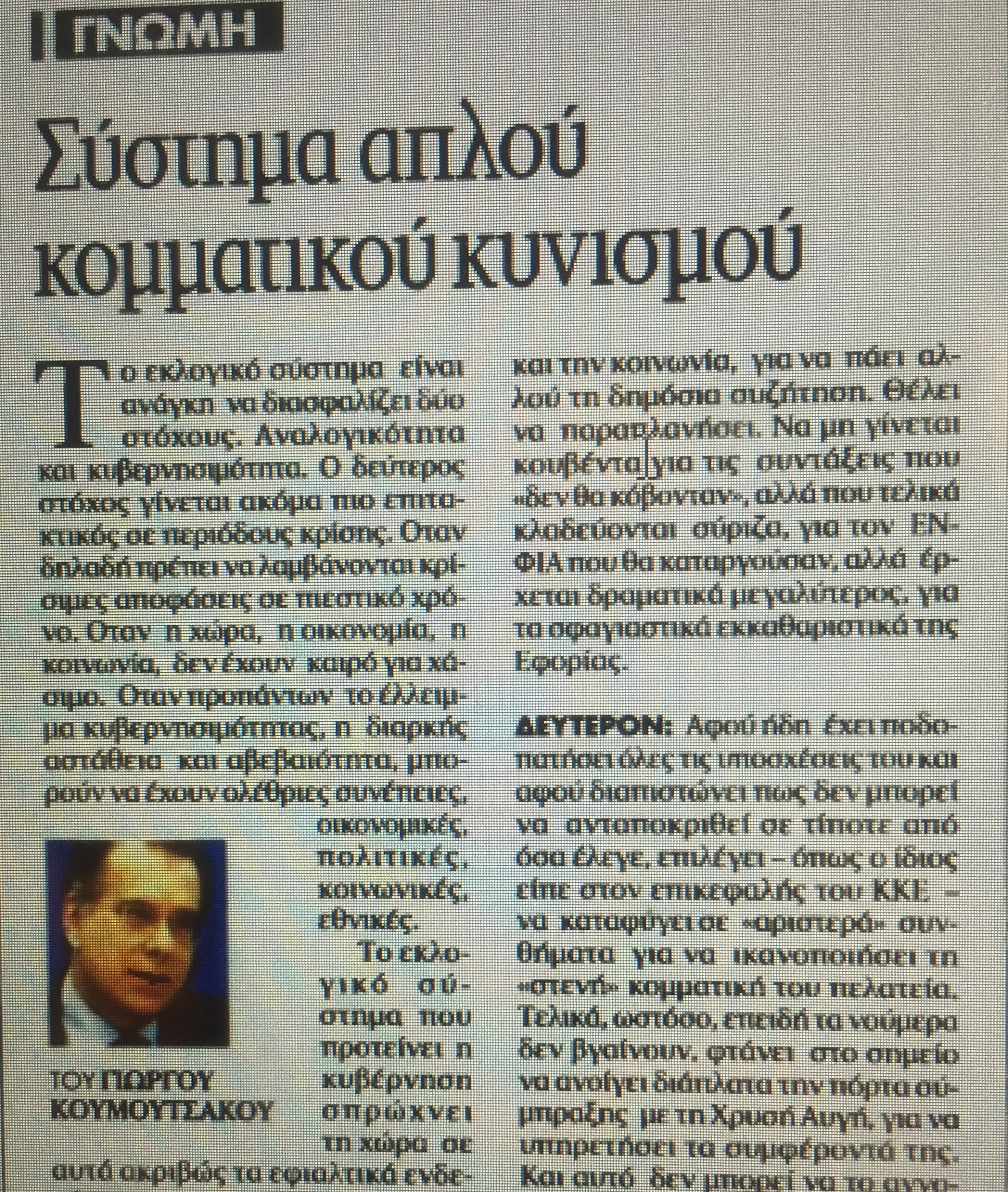Το εκλογικό σύστημα είναι ανάγκη να διασφαλίζει δύο στόχους. Αναλογικότητα και κυβερνησιμότητα. Ο δεύτερος στόχος γίνεται ακόμα πιο επιτακτικός σε περιόδους κρίσης. Όταν δηλαδή πρέπει να λαμβάνονται κρίσιμες αποφάσεις σε πιεστικό χρόνο. Όταν η χώρα, η οικονομία, η κοινωνία, δεν έχουν καιρό για χάσιμο. Όταν προπάντων το έλλειμμα κυβερνησιμότητας, η διαρκής αστάθεια και αβεβαιότητα, μπορούν να έχουν ολέθριες συνέπειες, οικονομικές, πολιτικές, κοινωνικές, εθνικές.