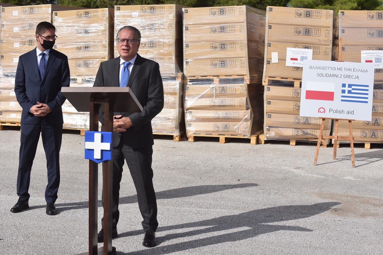 «Παραλάβαμε σήμερα 156 μονάδες για στέγαση, για να καλυφθούν οι ανάγκες που έχουν δημιουργηθεί το τελευταίο χρονικό διάστημα στη χώρα μας, ιδιαίτερα μετά τον εμπρησμό του Κέντρου Υποδοχής και Ταυτοποίησης στη Μόρια. Χαιρετίζω και ευχαριστώ την Πολωνία για αυτήν της την απόφαση, για αυτήν της την πρωτοβουλία. Eκτιμούμε αυτήν την κίνηση αλληλεγγύης. Μπορεί να μην έχουμε πάντα συγκλίνουσες απόψεις για την ευρωπαϊκή πολιτική μετανάστευσης. Αλλά τελικά, νομίζω, αυτό το οποίο προέχει είναι ότι η Ευρώπη λειτουργεί μαζί στην αντιμετώπιση της μεταναστευτικής πρόκλησης».