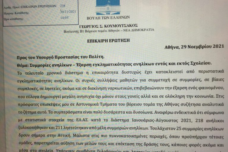 Νοέ302021 Επίκαιρη ερώτηση με θέμα: “Συμμορίες ανηλίκων – Έξαρση εγκληματικότητας ανηλίκων εντός και εκτός Σχολείου” ΔΙΑΒΑΣΤΕ ΠΕΡΙΣΣΟΤΕΡΑ
